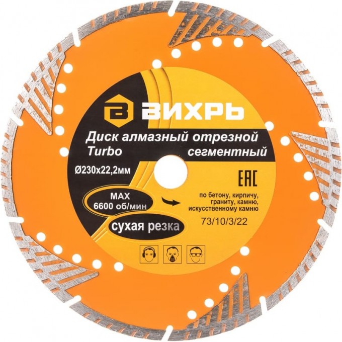 Диск алмазный отрезной Турбо - сегментный, 230 х 22,2 мм, сухая резка Вихрь - это алмазный отрезной диск, который используется совместно с угловыми шлифмашинами (болгарками) для сухой резки гранитных, бетонных, кирпичных и каменных изделий. Защитные сектора диска обеспечивают защиту режущего слоя от бокового износа.