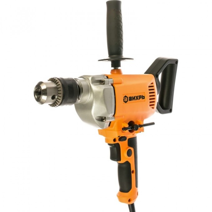 Комплектуется электроинструмент ключевым патроном, который обеспечивает надежную фиксацию сверла или биты. Для удобства хранения ключа предусмотрено специальное отверстие. Максимальная частота вращения дрели данной модели составляет 850 об./мин., кнопка выключения позволяет регулировать скорость, что удобно при работе с материалами разной плотности. Фиксация кнопки включения упрощает выполнение работ при большом объеме поставленных задач. Вихрь Д-1000М (дрель-миксер) имеет металлический корпус редуктора, чем обусловлена его надежность и долговечность.